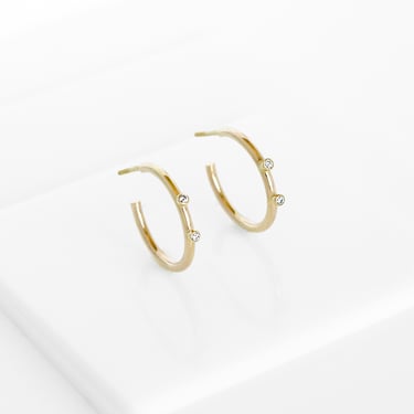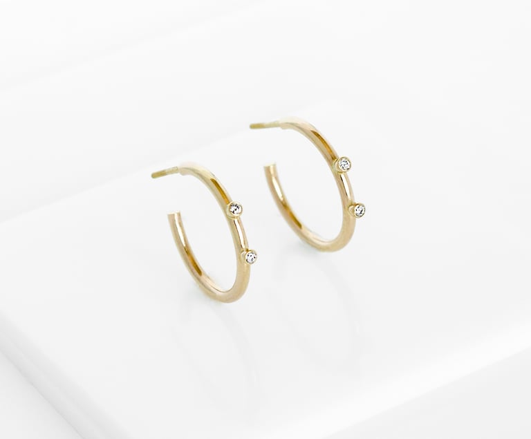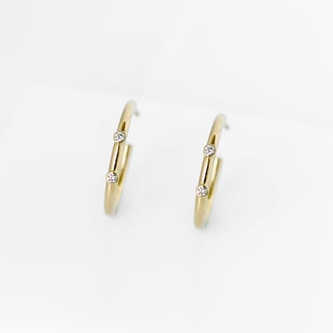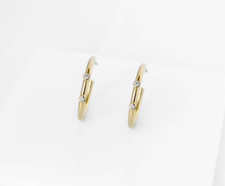 Poliruoti 750 prabos geltono aukso auskarai su keturiais 0,03ct briliantais. Klasikiniai žiedelių auskarai su mažyčiu prieskoniu.