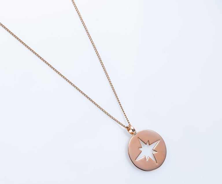 Poliruotas 585 prabos raudono aukso kaklo papuošalas. Aštuoniakampė žvaigždė simboliuoja kosmine pusiausvyra, harmonija ar tvarka.