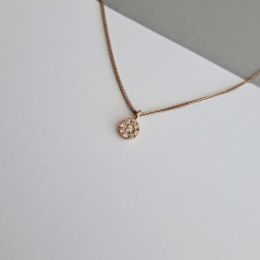 Aukso 585 prabos pakabukas su 9 mažais deimantais, kruopščiai išdėliotais kompozicijoje.