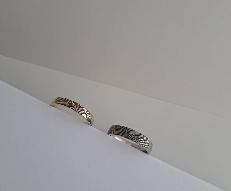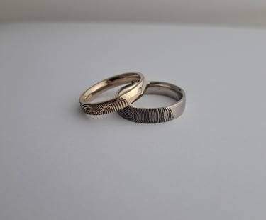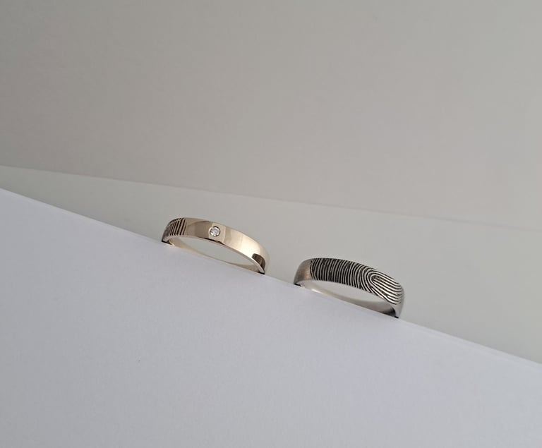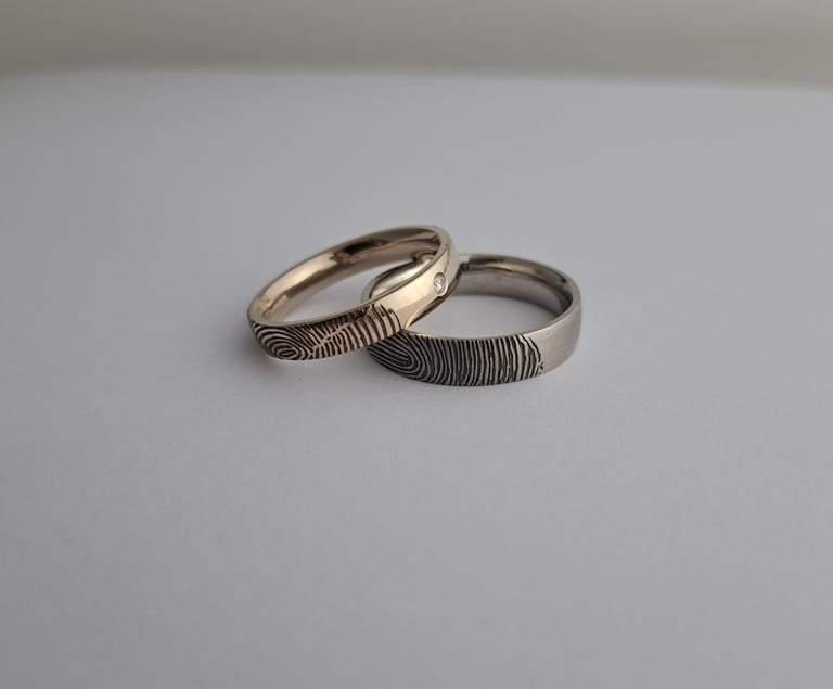 Balto aukso 585 prabos žiedai su vienas kito piršto atspaudu, moteriškas – 4 mm pločio su mažyčiu deimantuku, vyriškas – 5 mm pločio, dengtas rodžiu