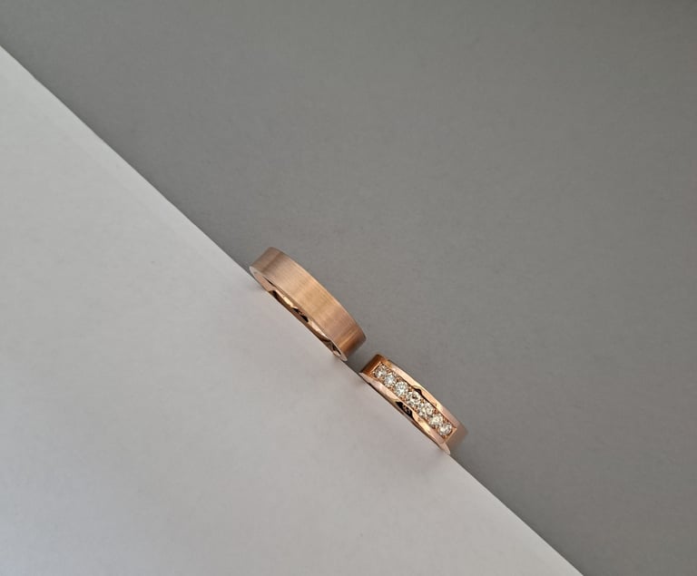 Prabangūs 585 prabos raudono aukso žiedai. Moteriškas žiedas 5mm pločio, poliruotas, puoštas 7 vienetais 0,06ct briliantų. Vyriškas 5 mm pločio, grubesnės tekstūros, matinis.