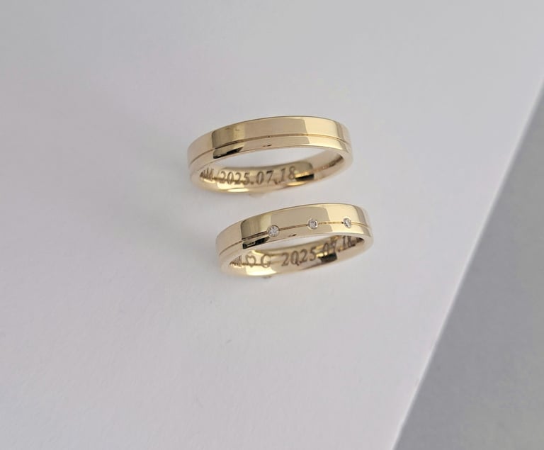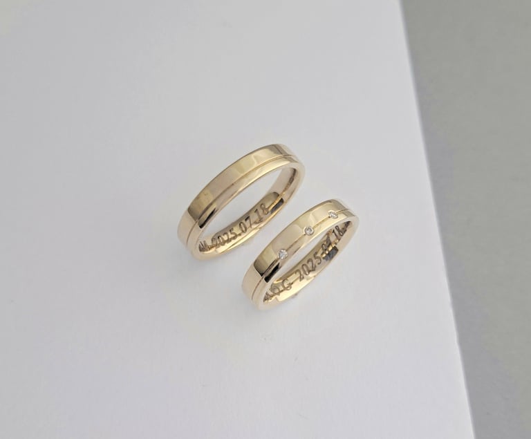 Geltono aukso 585 prabos žiedai, 4 mm pločio, abu žiedai – su subtilia linija, moteriškas – papildomai su trimis mažyčiais deimantukais.