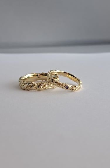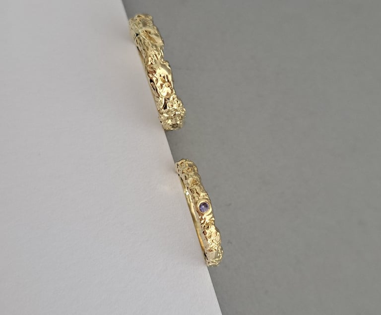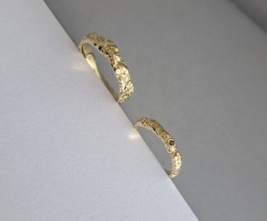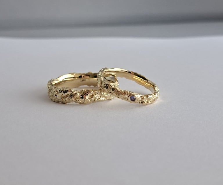 Geltono aukso 585 prabos žiedai su išskirtine tekstūra, moteriškas – 3 mm pločio su violetiniu safyru, vyriškas – 4 mm pločio.