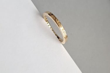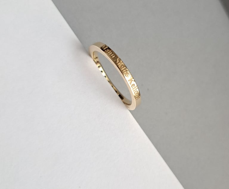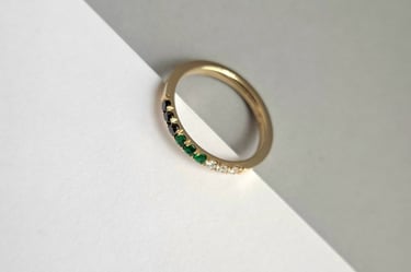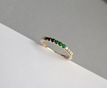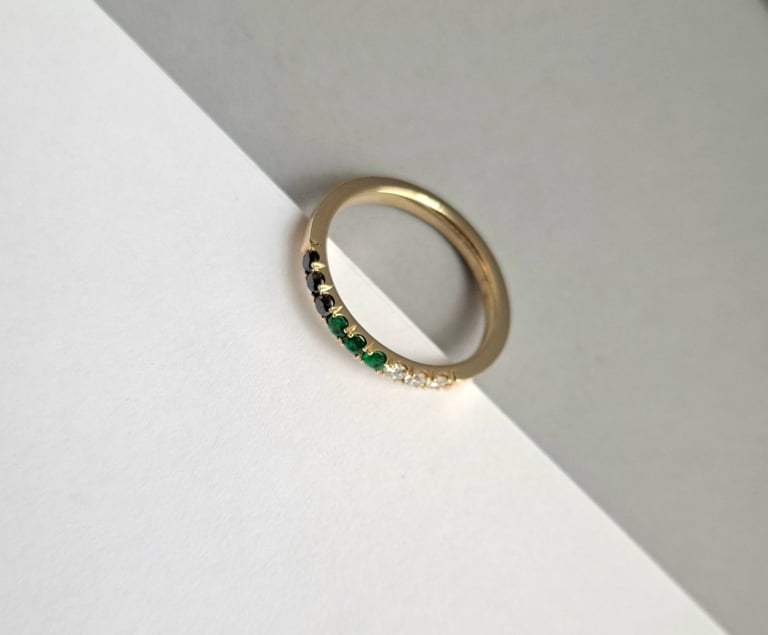 Poliruotas 585 prabos geltono aukso 2mm pločio žiedas su trimis baltais 0,03ct briliantais, trimis 0,03ct smaragdais ir trimis 0,03ct juodais briliantais.
