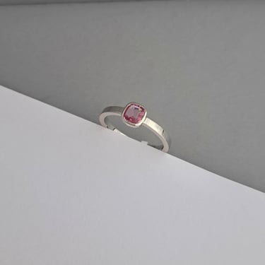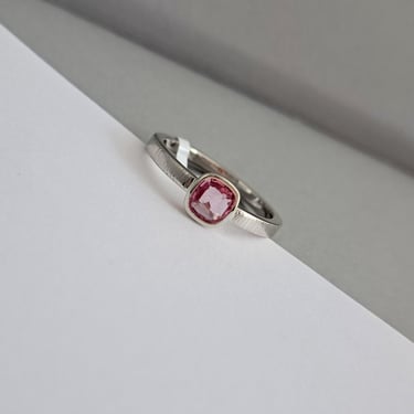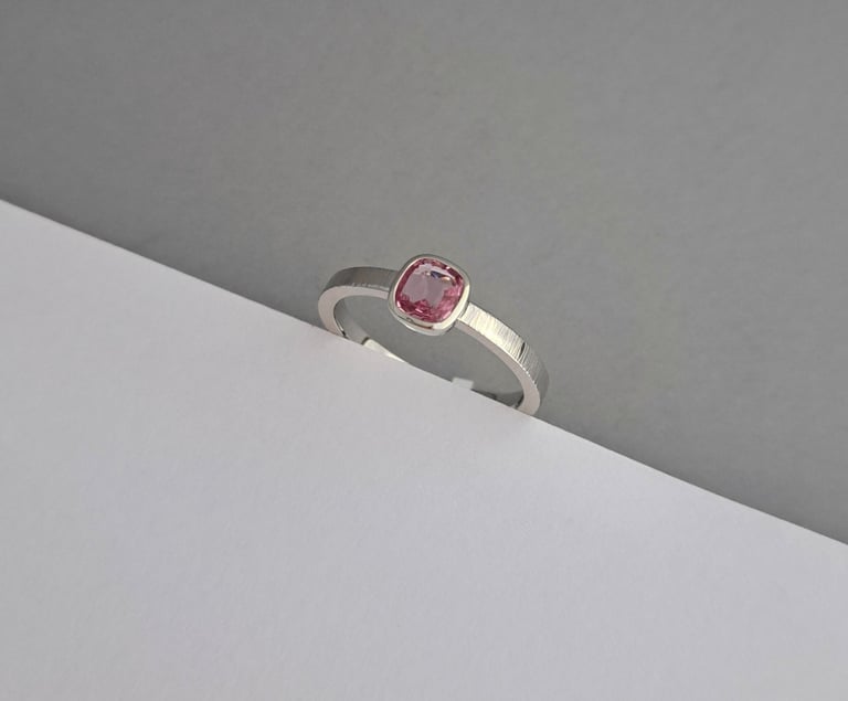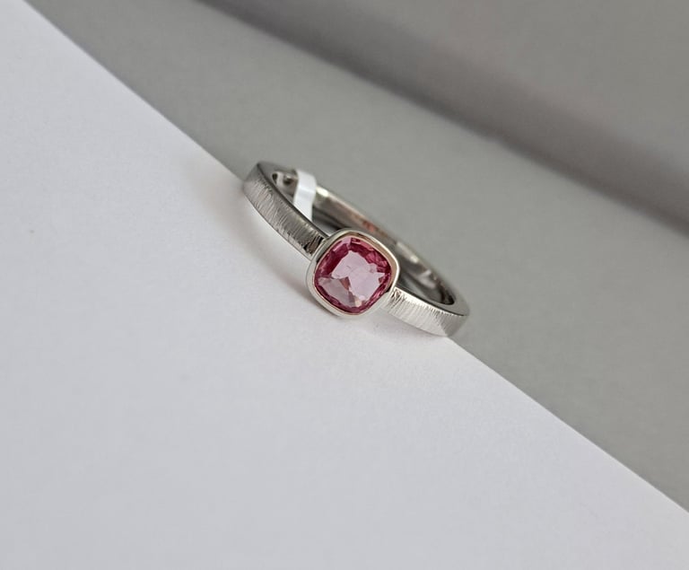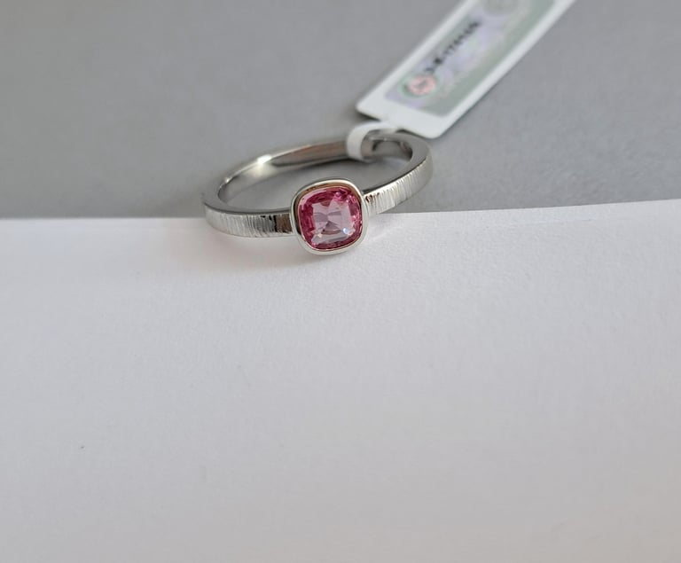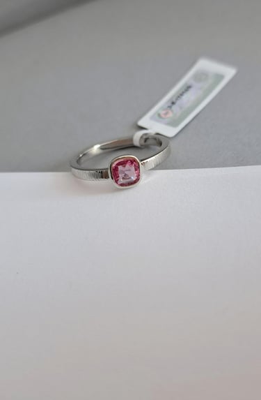 Balto aukso 585 prabos žiedas su 0,70 ct rožiniu safyru, cushion cut šlifavimo.