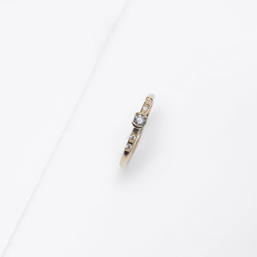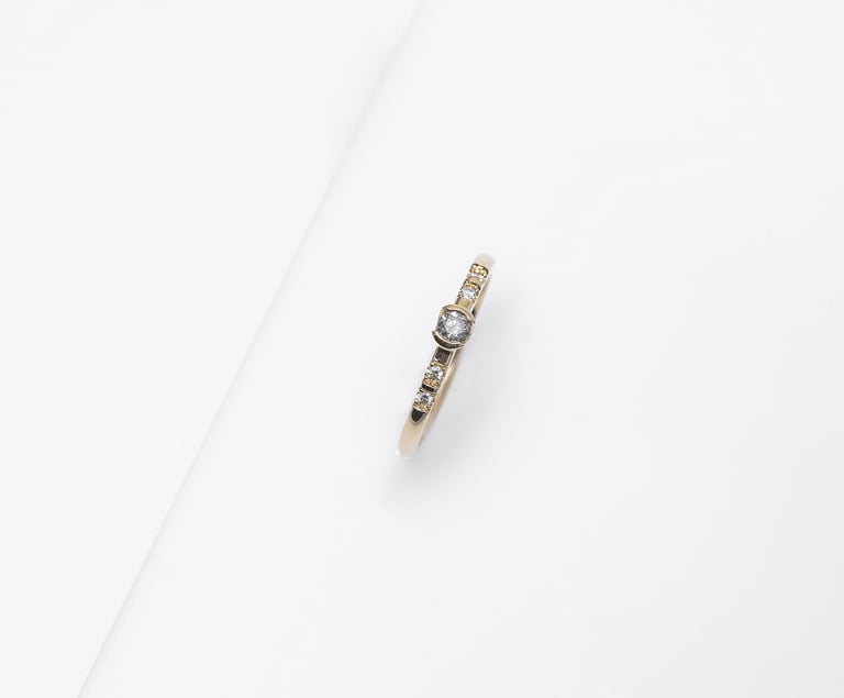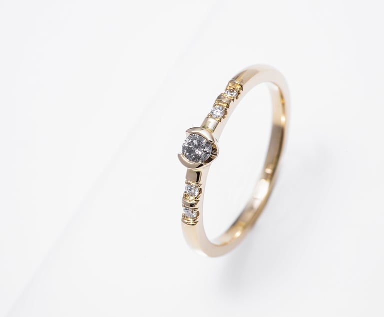 Poliruotas 585 prabos aukso žiedas su centre esančiu salt and pepper deimantu ir keturiais baltais deimantais šonuose. Salt and pepper deimantai yra unikalūs dėl matomų intarpų ir įvairių spalvų – nuo beveik bespalvių iki pilkų ar rudų. Šios ypatybės sukuria išskirtinius raštus, todėl kiekvienas deimantas yra unikalus.