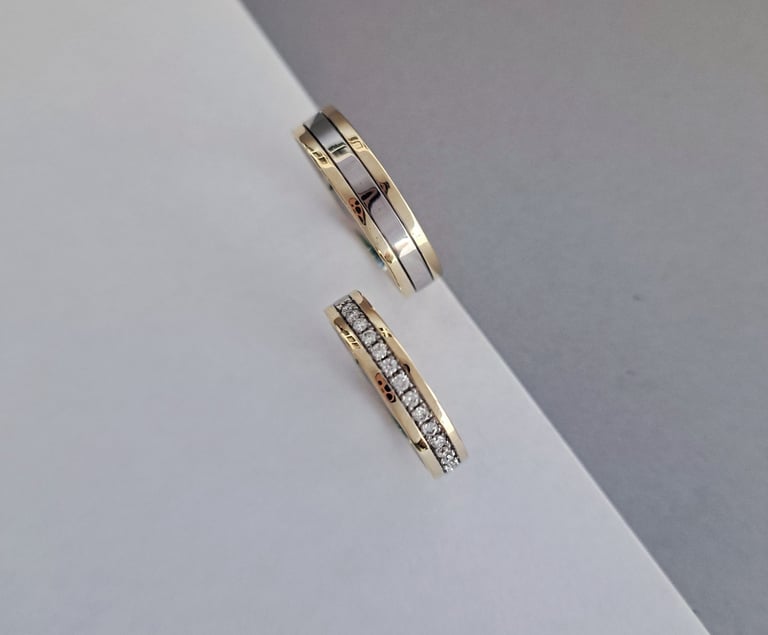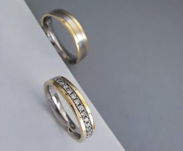 Švytintys, modernūs ir prabangūs 585 prabos balto ir geltono aukso žiedai. Moteriškas žiedas 4 mm pločio puoštas 16 vienetų 0,02ct briliantų. Vyriškas švelniai platesnis - 5mm. Tiesus žiedų profilis bei įbrėžtos griežtos linijos įkvėpia modernumo, o skirtingos aukso spalvos sukuria prabangos įvaizdį.