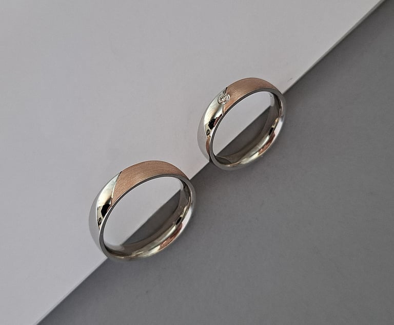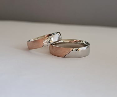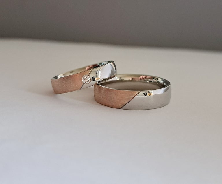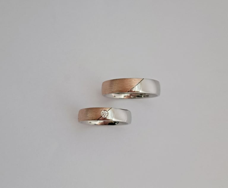 Raudono ir balto 585 prabos žiedai lengvai gaubtu profiliu. Du poliai - skirtingi, bet vienas kitą tobulai papildantys. Balto aukso pusė poliruota, raudono - dengta šiaušta tekstūra. Moteriškas žiedas 4mm pločio, puoštas 0,03ct briliantu, vyriškas - 5mm pločio.
