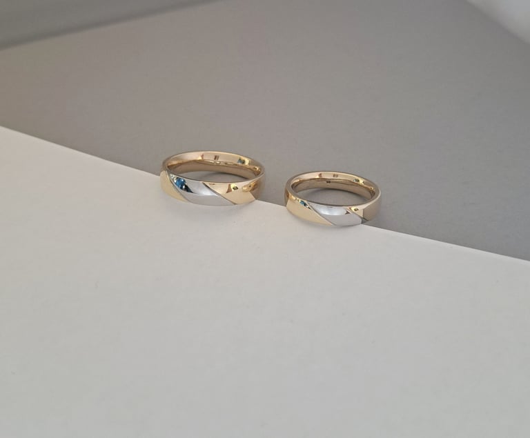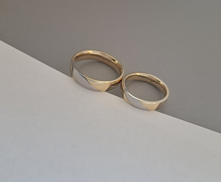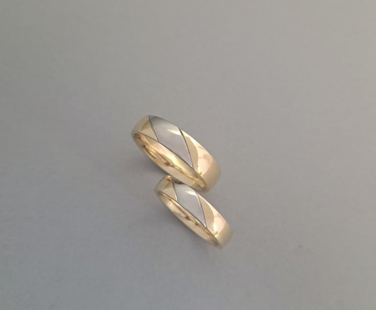 Poliruoti, didelio išorinio gaubimo 585 prabos geltono aukso žiedai su balto aukso juosta.
