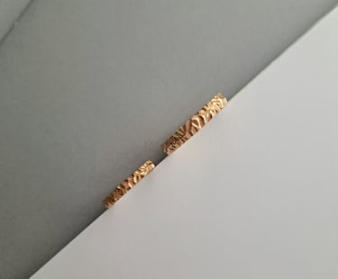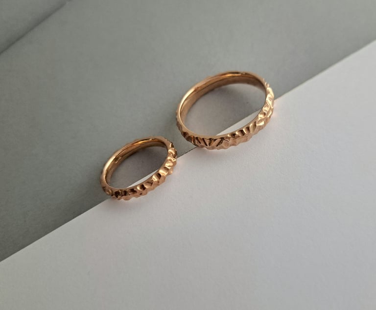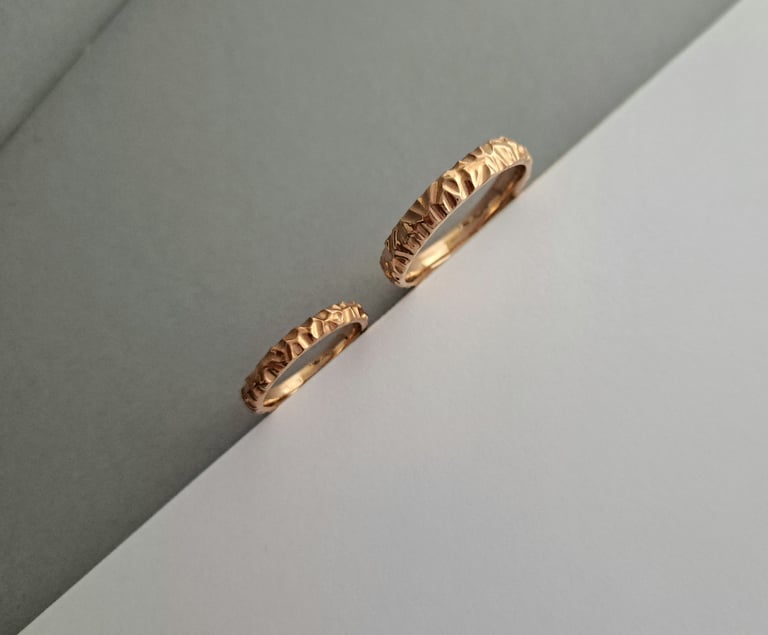 Tekstūruoti 585 prabos raudono aukso žiedai. Švelniai laužiatys šviesą ir žėrintys skirtingais kampais. Vyriškas žiedas 5 milimetrų pločio, moteriškas - 4 milimetrų