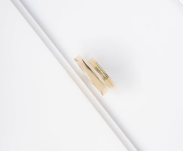 585 prabos geltono aukso žiedai. Poliruoti, moteriškas tekstūruotas, sukuriant plunksnelės vaizdą.