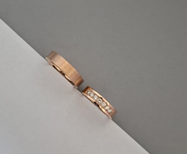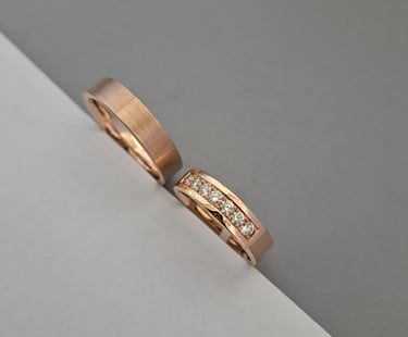 Prabangūs 585 prabos raudono aukso žiedai. Moteriškas žiedas 5mm pločio, poliruotas, puoštas 7 vienetais 0,06ct briliantų. Vyriškas 5 mm pločio, grubesnės tekstūros, matinis.