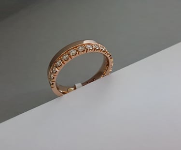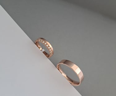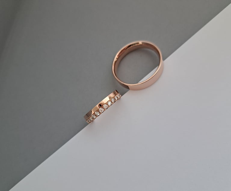 Prabangūs 585 prabos raudono aukso žiedai. Modernūs, tiesaus profilio su komforto zona. Moteriškas žiedas 4 mm pločio puoštas 16 vienetų 0,03ct briliantų. Vizualiai dalintas pusiau tarp deimantų ir auksinės pusės. Vyriškas moderniai klasikinis, švelniai platesnis - 5mm pločio.